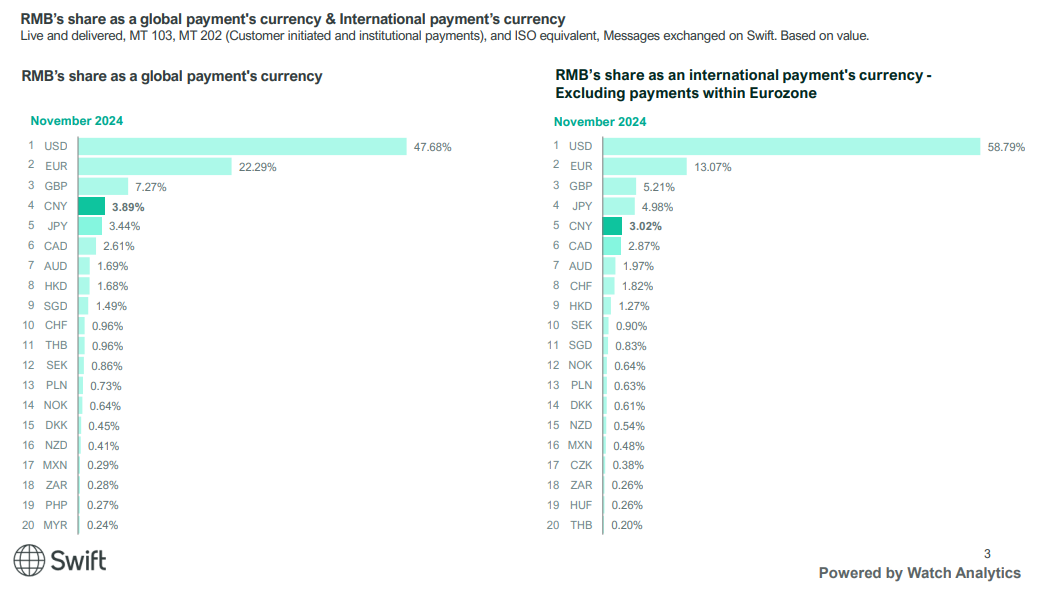 SWIFT:11月人民幣位居全球第四大支付貨幣,佔比3.89%