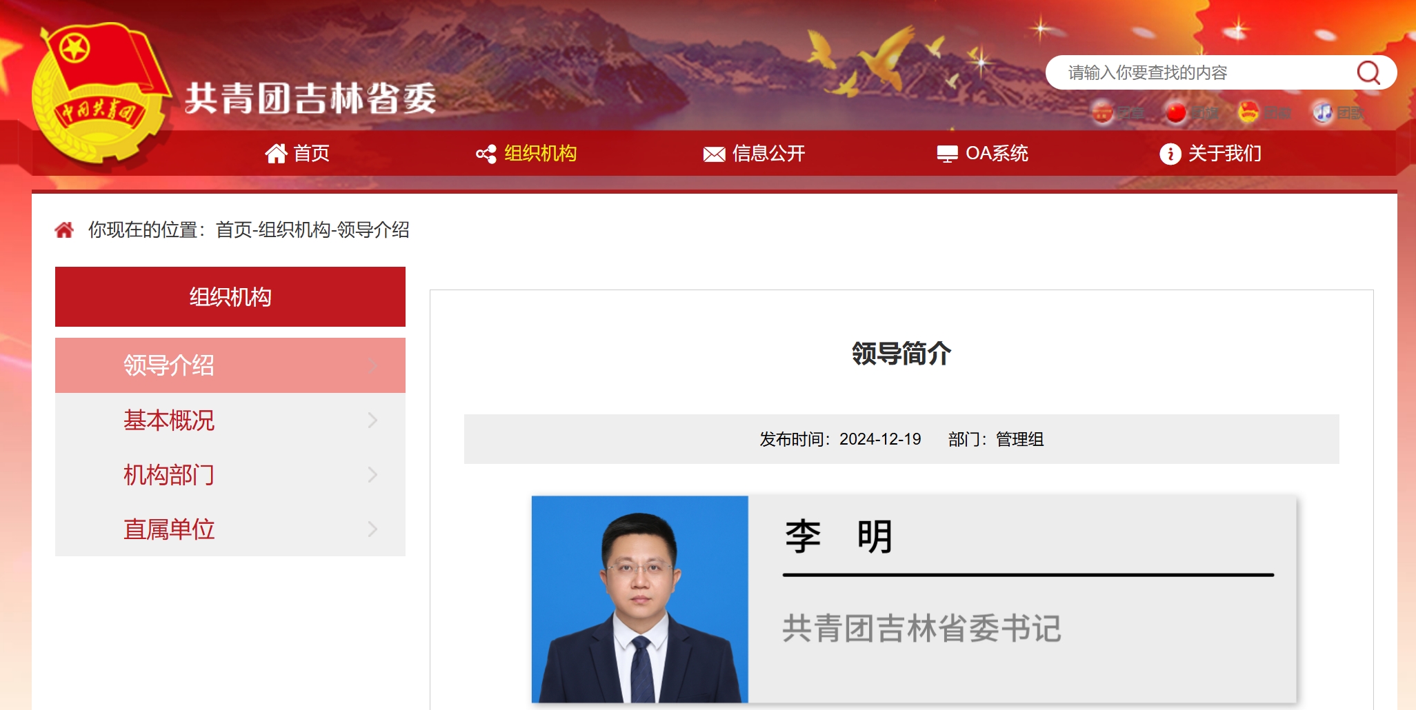共青團吉林省委官網“領導簡介”一欄顯示,此前獲公示擬任正廳級領導職務的“85後”幹部、遼源市副市長李明現已出任共青團吉林省委書記。
