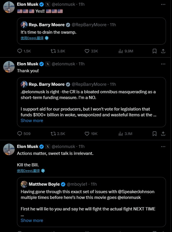 約翰遜臨時預算案被“斃”後,馬斯克在X上吹噓道,“你們選擇的代表已經聽到了你們的聲音,現在這個可怕的法案已經死了”,“人民的聲音勝利了”!