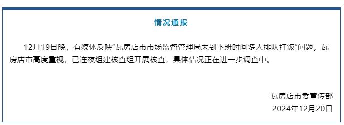 據“瓦房店發佈”公眾號消息,遼寧瓦房店市委宣傳部12月20日通報稱,19日晚,有媒體反映“瓦房店市市場監督管理局未到下班時間多人排隊打飯”問題。瓦房店市高度重視,已連夜組建核查組開展核查,具體情況正在進一步調查中。