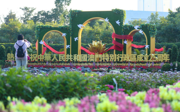 國旗區旗迎風飄揚,條幅海報遍佈街頭巷尾,豐富多彩的慶祝活動輪番登場……連日來,澳門處處洋溢歡樂喜慶的氣氛,全城熱烈慶祝迴歸祖國25週年。
