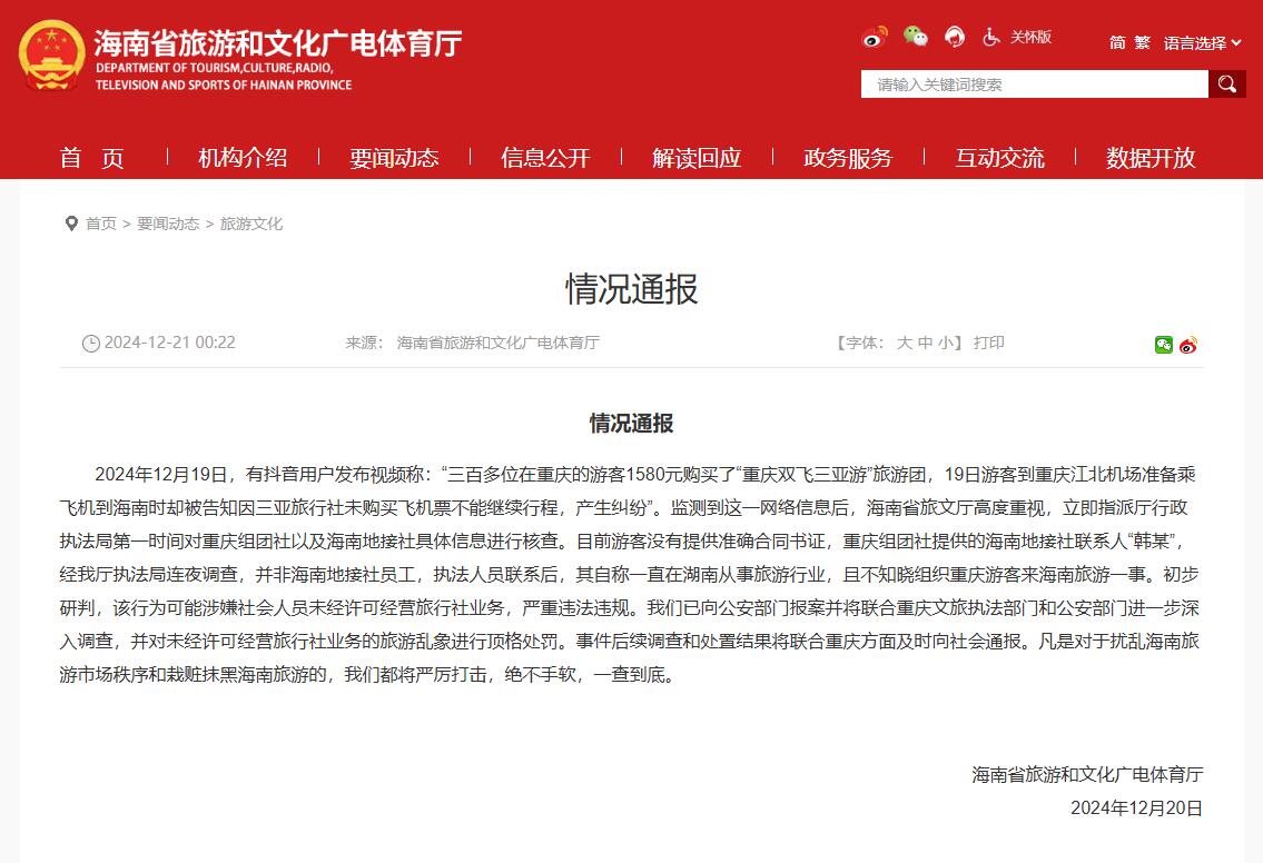 12月21日,海南省旅遊和文化廣電體育廳網站就網傳“重慶三百多位老人到機場才知沒買機票”一事,發佈情況通報:
