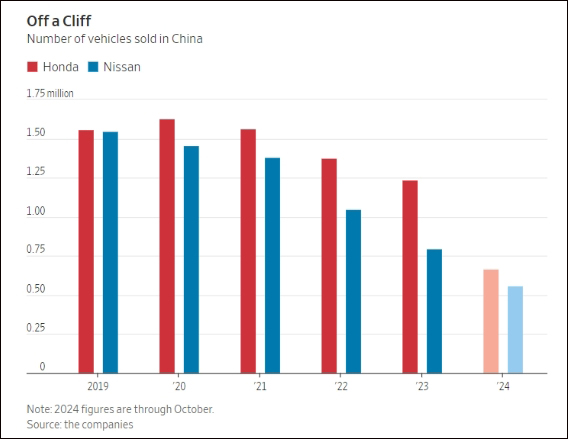 近年來,本田(紅色)和日產(藍色)在中國的汽車銷量大幅下降 《華爾街日報》製圖