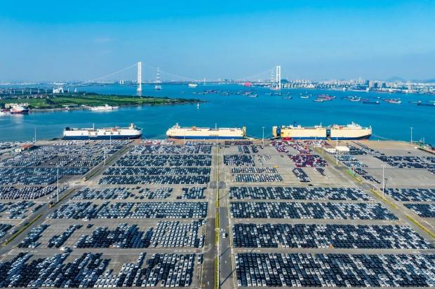 △2024年10月7日,廣東廣州港南沙汽車碼頭,大量的新能源汽車正準備裝上滾裝輪船,通過海運銷向世界各地。