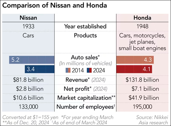 本田和日產的對比,從上至下維度分別為:創立時間、產品範圍、汽車銷量、2024年收入、2024年淨利潤、市值、員工人數 《日經亞洲評論》製圖