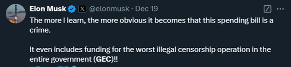 “今日俄羅斯”(RT)稱,馬斯克在這件事上發揮了重要的作用。報道稱,眾議院議長約翰遜提交的一份長達1547頁的預算案中,本保留了應該提供給GEC的資金(沒有單獨列出GEC的名字),但馬斯克對該預算案發起了譴責、威脅,迫使約翰遜換了一個更精簡、沒有包括GEC資金的提案,這個提案最終在國會通過。作為特朗普新設立的“政府效率部”(DOGE)的領導者,馬斯克未來的任務是減少政府支出。