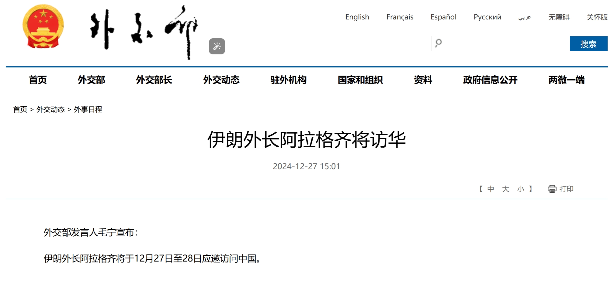 伊朗外長阿拉格齊將於12月27日至28日應邀訪問中國。