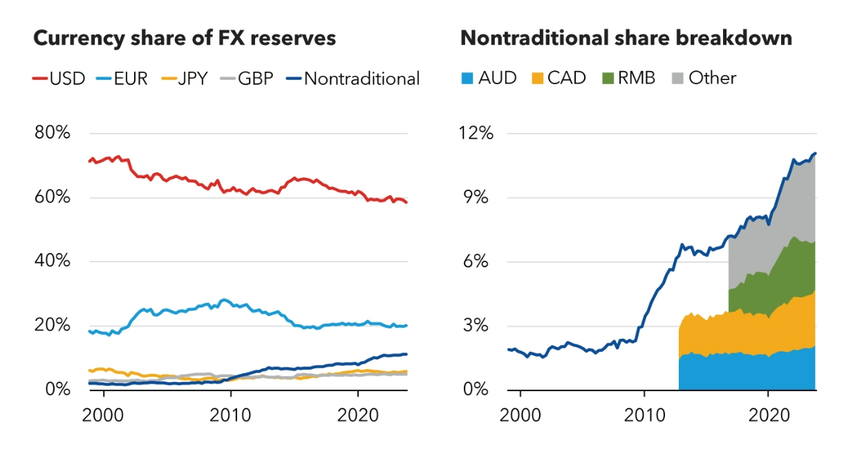 儘管美元份額在過去三個季度一直在穩步下降,但“非傳統”貨幣的份額一直在上升。