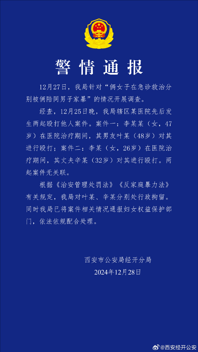 “兩女子在急診室分別被家暴”,西安警方通報:兩男子被行拘