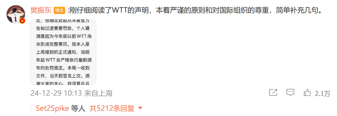 12月29日,樊振東再回應為何退出世界排名。 微博
