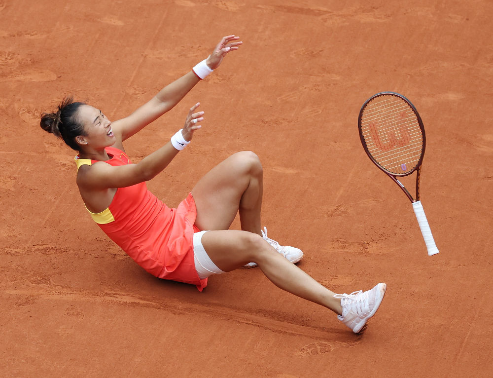 中國選手鄭欽文在巴黎奧運會網球女子單打金牌賽後慶祝奪冠。新華社記者 高靜 攝