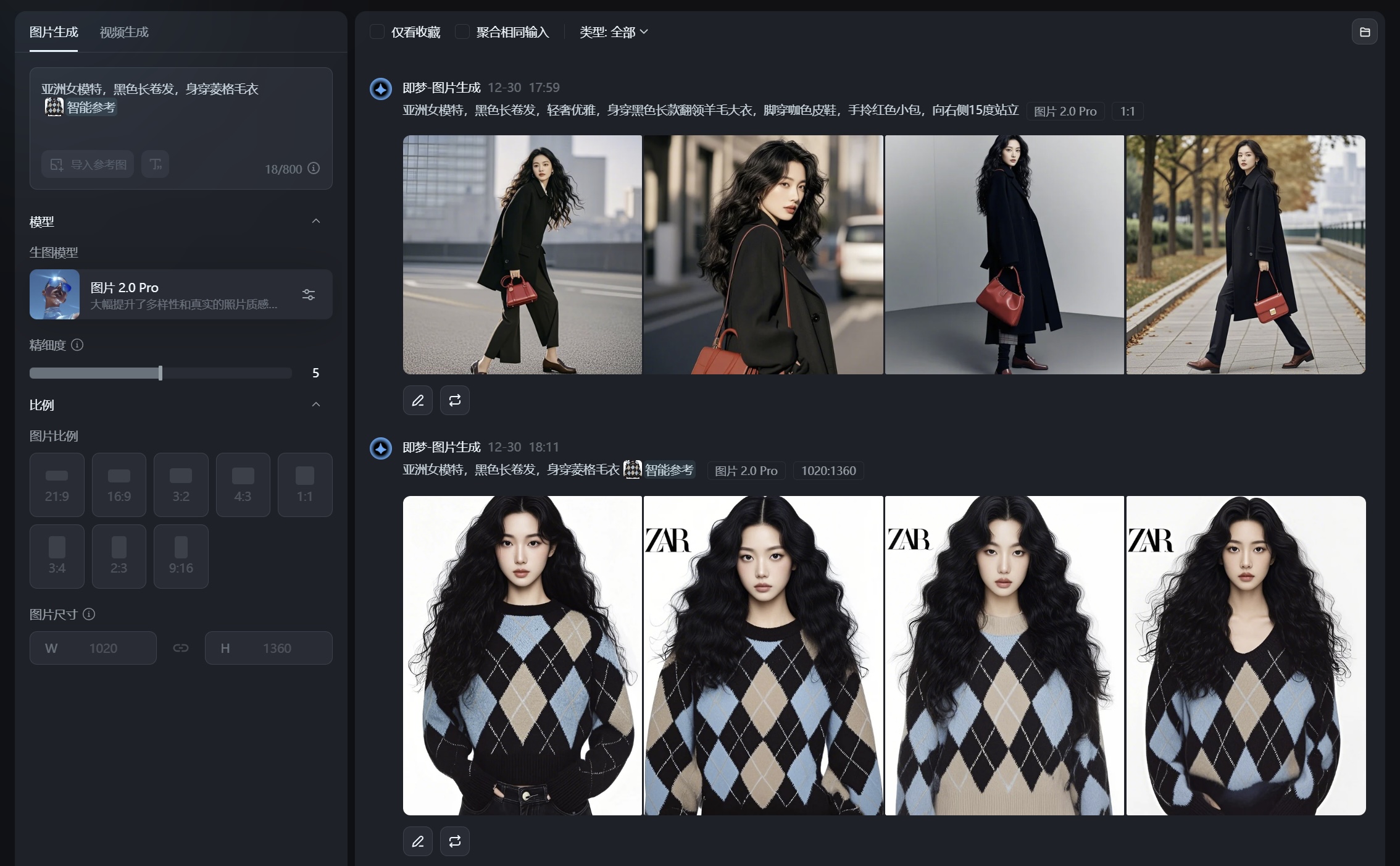 對比來看,即夢AI尚未上線專門的AI模特功能,不過,我們可以輸入相關描述來生成模特,如要試衣,則需另外描述,並導入所試衣服圖片。