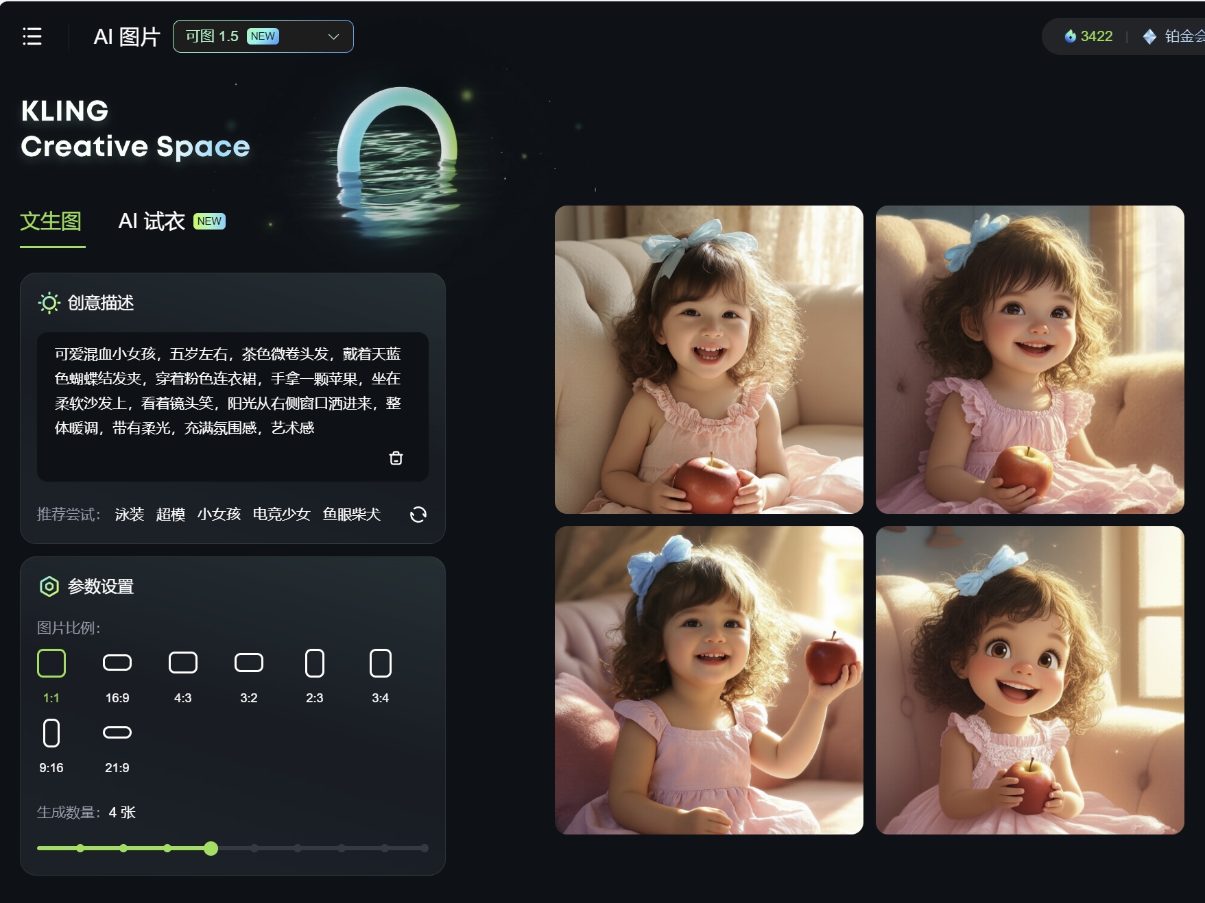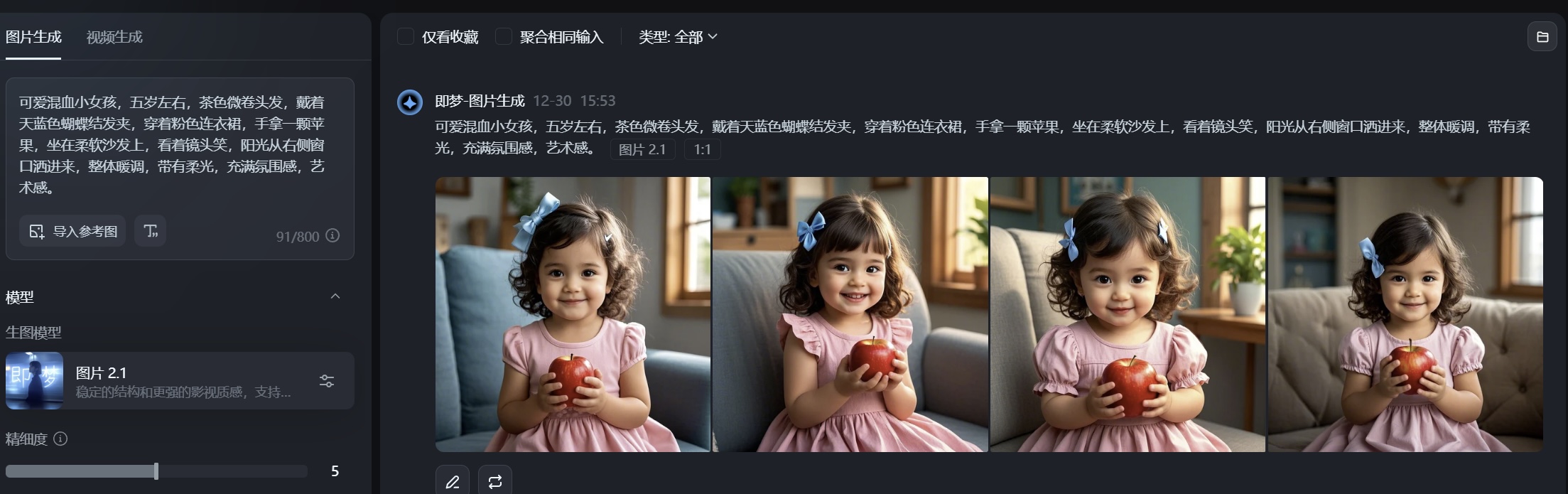 實測中,我們在創意描述中輸入了關鍵詞:可愛混血小女孩,五歲左右,茶色微卷頭髮,戴着天藍色蝴蝶結髮夾,穿着粉色連衣裙,手拿一顆蘋果,坐在柔軟沙發上,看着鏡頭笑,陽光從右側窗口灑進來,整體暖調,帶有柔光,充滿氛圍感,藝術感。
