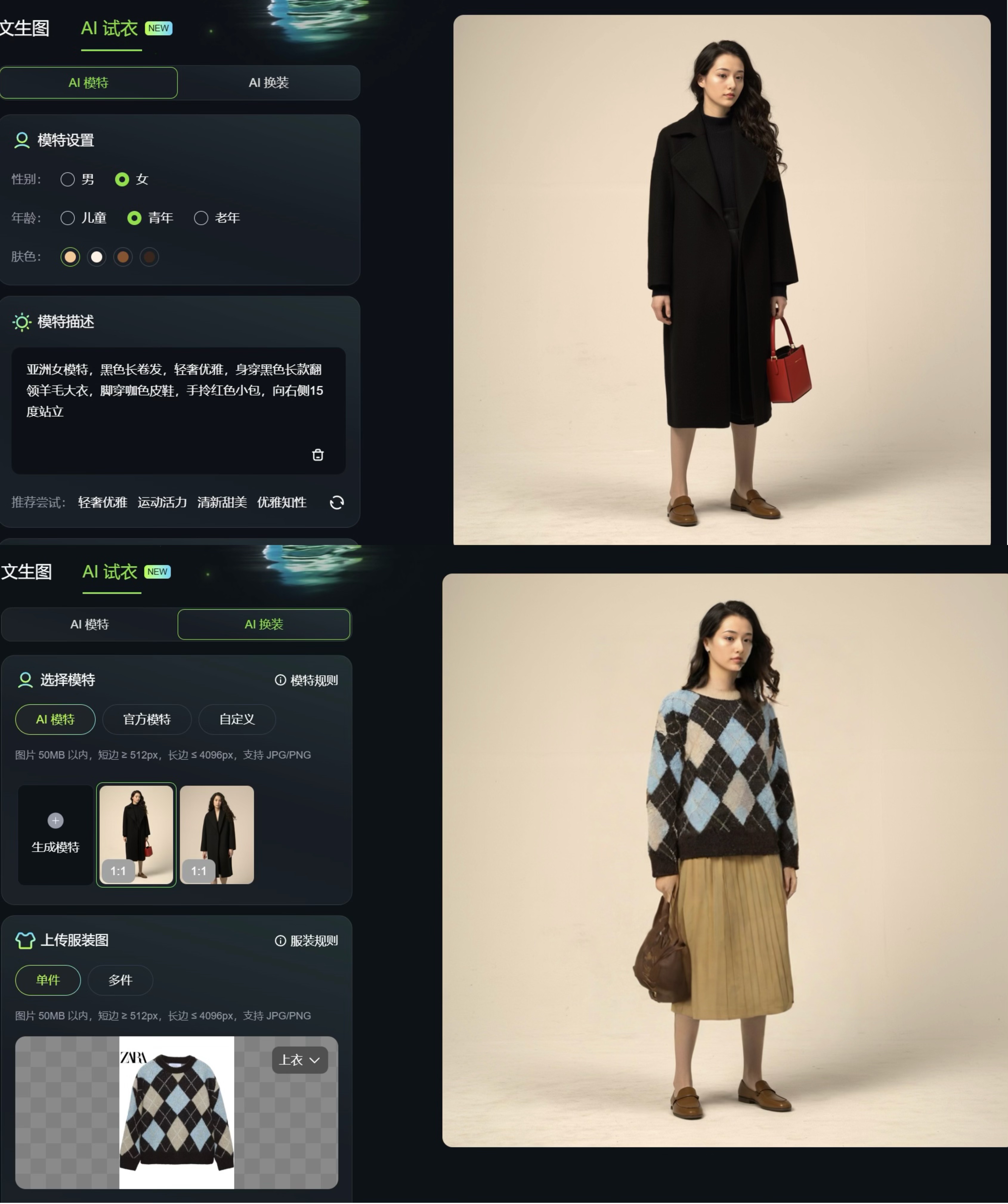 實際操作中,不僅生成了滿足要求的AI模特,而且AI模特功能還可無縫銜接AI換裝,輕鬆完成模特對我們指定服裝的更換及搭配展示。甚至可再配合可靈1.6版本的圖生視頻能力,生成動態服裝展示視頻。