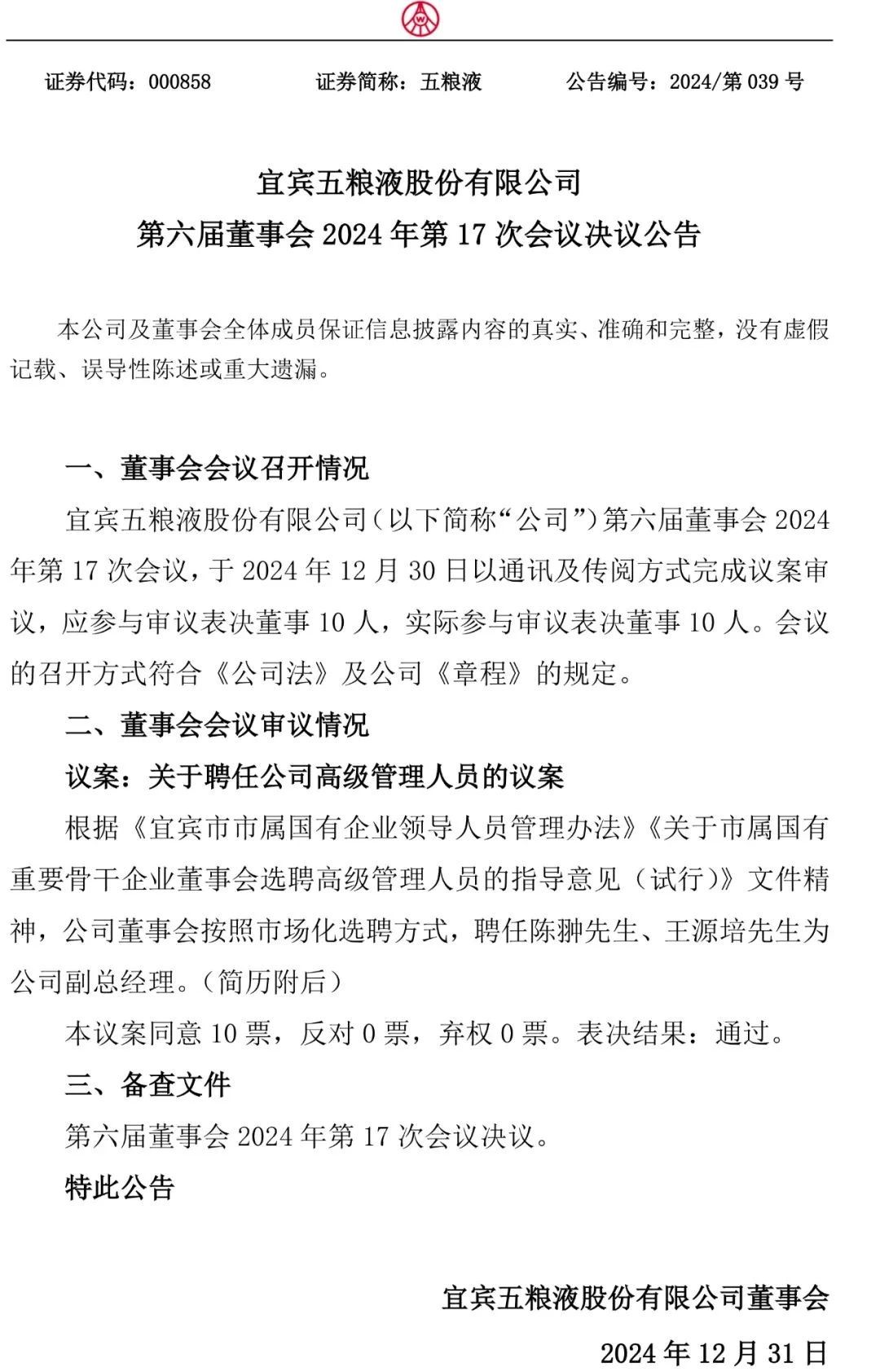 (文/朱道義 編輯/馬媛媛)12月30日,宜賓五糧液股份有限公司(以下簡稱“五糧液”)發佈公告,聘任陳翀、王源培為公司副總經理。