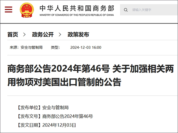 ·中國禁止兩用物項對美國軍事用户或軍事用途出口,嚴控鎵、鍺、銻、超硬材料、石墨相關兩用物項對美國出口。