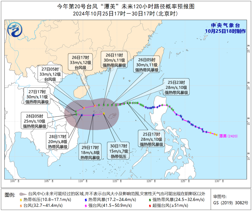 預計,“潭美”將以每小時20-25公里的速度向偏西方向移動,強度緩慢增強,最強可達強熱帶風暴級或颱風級(30-35米/秒,11-12級),27日夜間開始逐漸轉向偏東方向移動,強度逐漸減弱。
