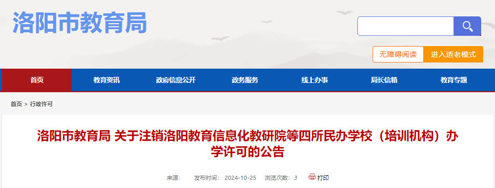 根據學校(培訓機構)申請,依據《中華人民共和國民辦教育促進法》及其他相關法規,我局擬對洛陽教育信息化教研院、河南艾希教育培訓學校有限公司、洛陽華英外語實驗學校、洛陽聚師教師教育培訓中心有限公司終止辦學並予以註銷,學校(培訓機構)註銷後不再具備辦學資格。四所學校(培訓機構)信息如下: