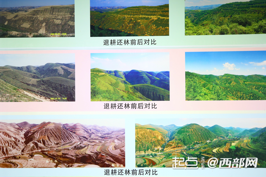 在延安吳起縣退耕還林展覽館內,一張動態遙感植被覆蓋圖見證了吳起縣從“一棵樹”到“一片林”的蜕變:光禿禿的山峁從土黃變成淺綠,再變為深綠。
