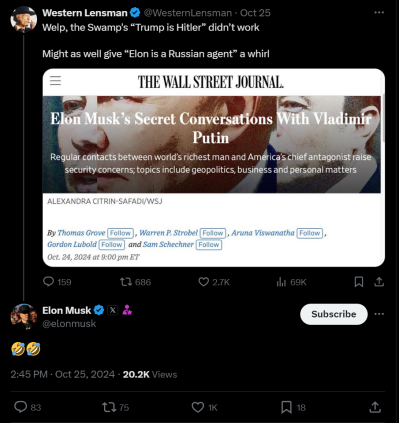 據福克斯商業頻道網站報道,對於《華爾街日報》這一爆料,馬斯克本人於25日在社交媒體X上疑似進行了回應。報道稱,一名網友對相關報道評論稱,這是有人在嘗試推出“馬斯克是俄羅斯特工”的説法。對此,馬斯克在下方回覆了兩個“笑哭”的表情。