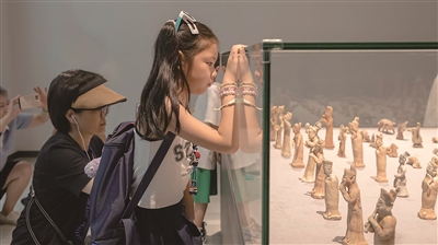 行進在博物館中,不時遇見研學體驗的師生。在老師帶領下,景德鎮昌江區中心幼兒園的學生圍在展櫃旁,認真聆聽講解員的介紹。