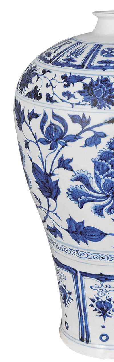 不妨想象:工匠先在坯胎上用青花料繪畫,再施以透明釉,最後在高温下一次燒成。奇妙的藍色紋樣隨即浮現,色澤鮮麗,有金屬光澤。