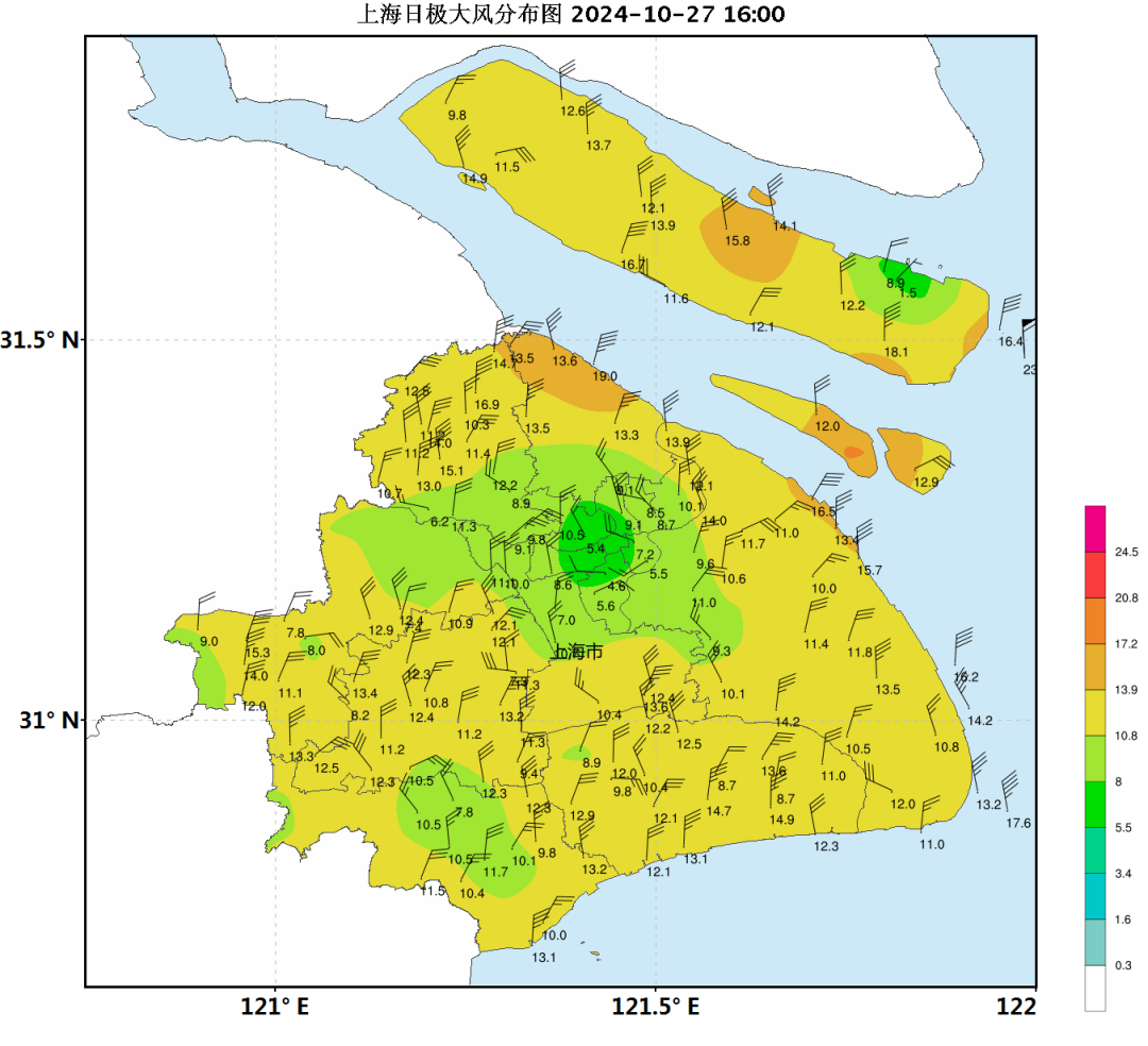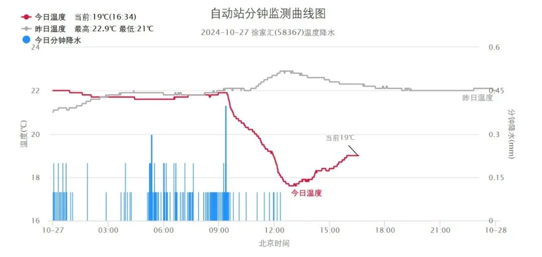 上海今天上午雨勢比較明顯,中午起雨勢有所減弱。昨天20時到今天16時的雨量統計顯示,全市多在中雨量級,局部地區有大雨。其中,楊浦五角場鎮最大,為34.0毫米。隨着冷空氣南下,今天下午偏北風增大,沿江沿海地區出現7~8級陣風,崇明東灘最大,達9級。今天午後體感明顯變涼,徐家彙站白天最高氣温是出現在上午8時58分,為21.9℃。夜間氣温繼續下跌,晚歸記得多穿一點。