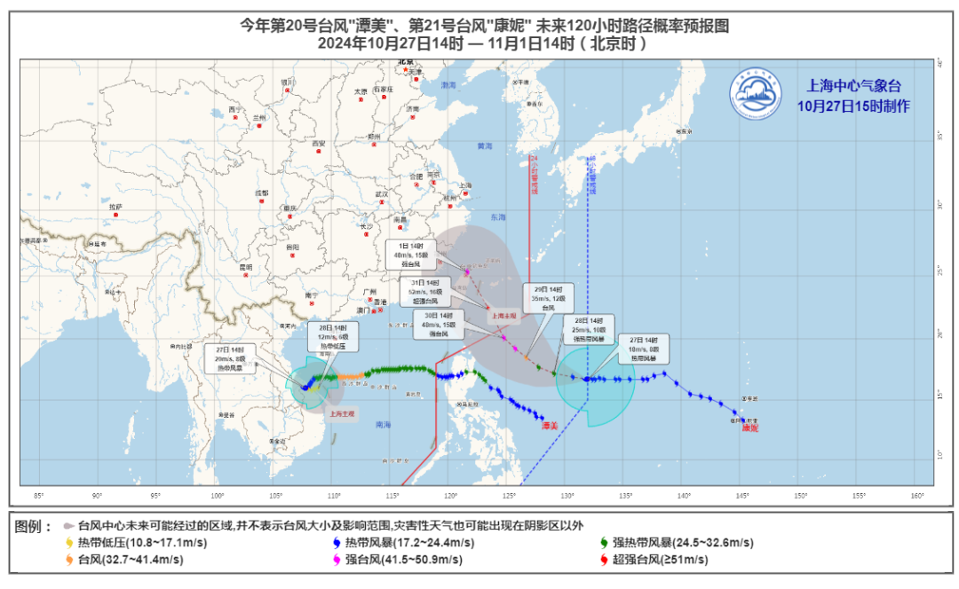 今年第21號颱風“康妮”(熱帶風暴級),今天14時位於台灣省花蓮市東南方向約1350公里的西北太平洋洋麪上。從最近預報來看,“康妮”路徑繼續西調,很可能在我國台灣省登陸。11月1日前後,上海可能受到“康妮”外圍偏東氣流影響,颱風路徑仍存在變數。