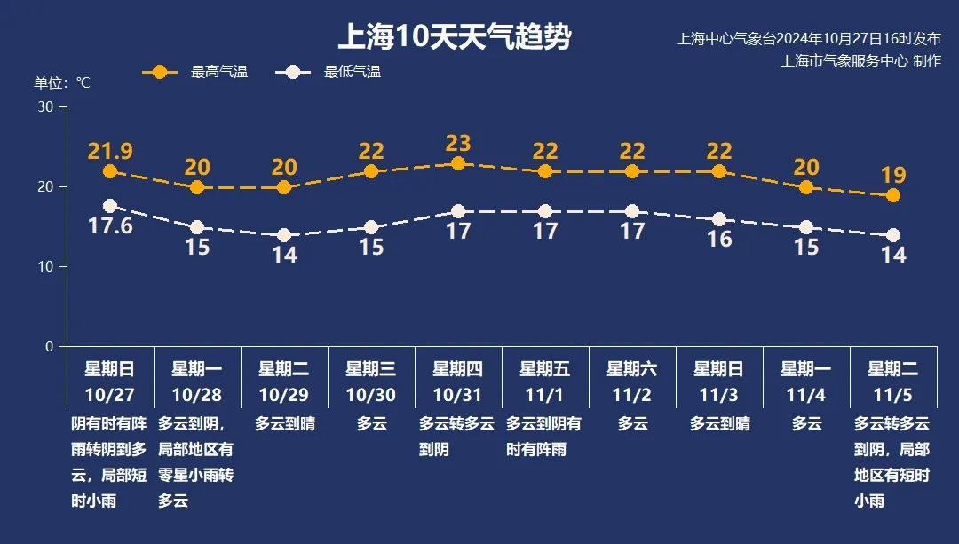 上海今天(10月27日)又是被陰雨籠罩的一天,明天(週一)將以多雲到陰天氣為主,局部地區仍有些小雨,氣温進一步下降,在15~20℃之間。週二到週四,上海主要受高氣壓控制,將迎來晴好天氣。