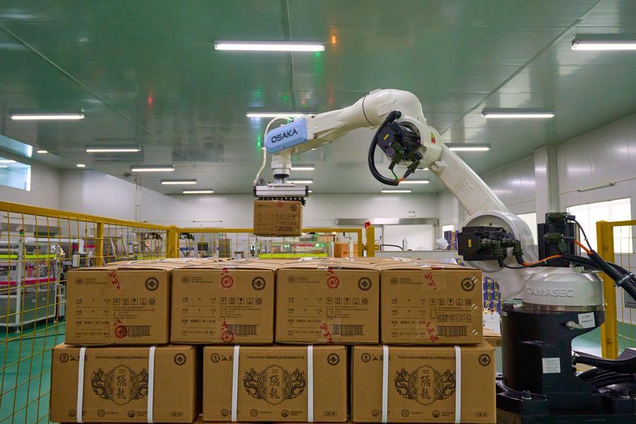 貴州山王果健康實業有限公司5G智慧工廠全自動包裝線正在工作。(新華社發)