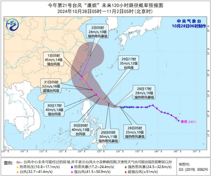 中央氣象台提醒,不管“康妮”登陸不登陸,風雨影響基本跑不了 ,目前來看,10月31日至11月2日,台灣島、福建東部、浙江 、上海等地雨勢強勁,大家要加強對台風的關注,提前做好準備。