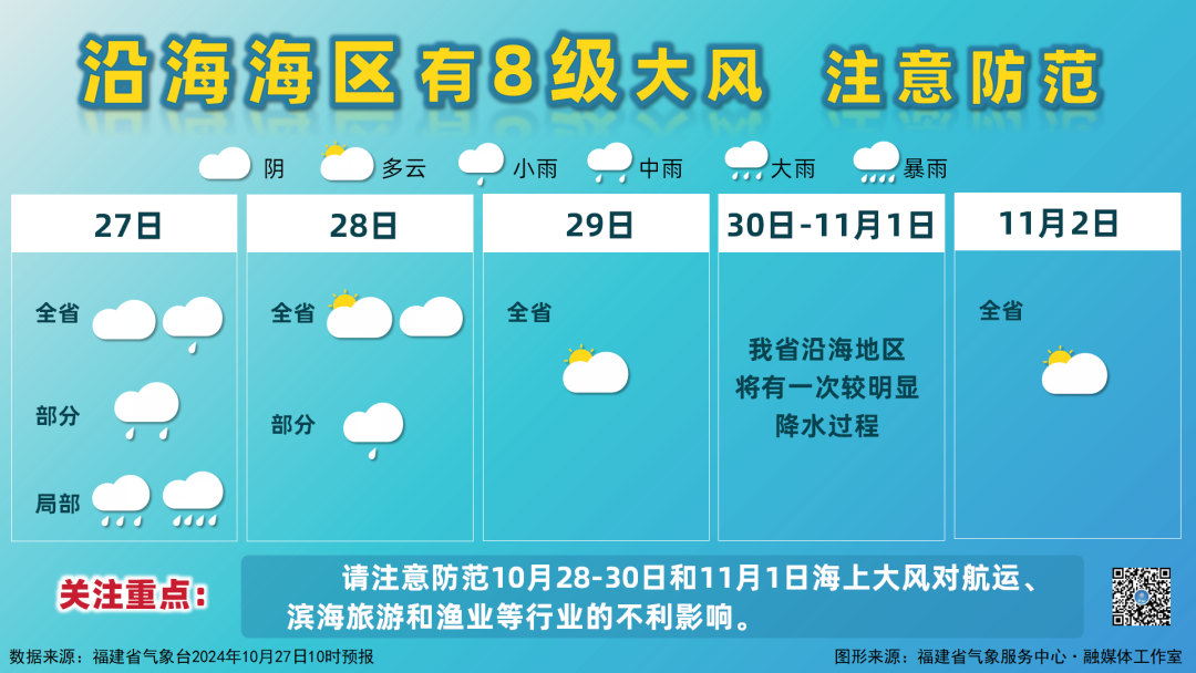 10月30日,中北部沿海海區及閩東漁場西部和閩中、閩南、台灣淺灘漁場最大風力可達7~9級、陣風9~11級。
