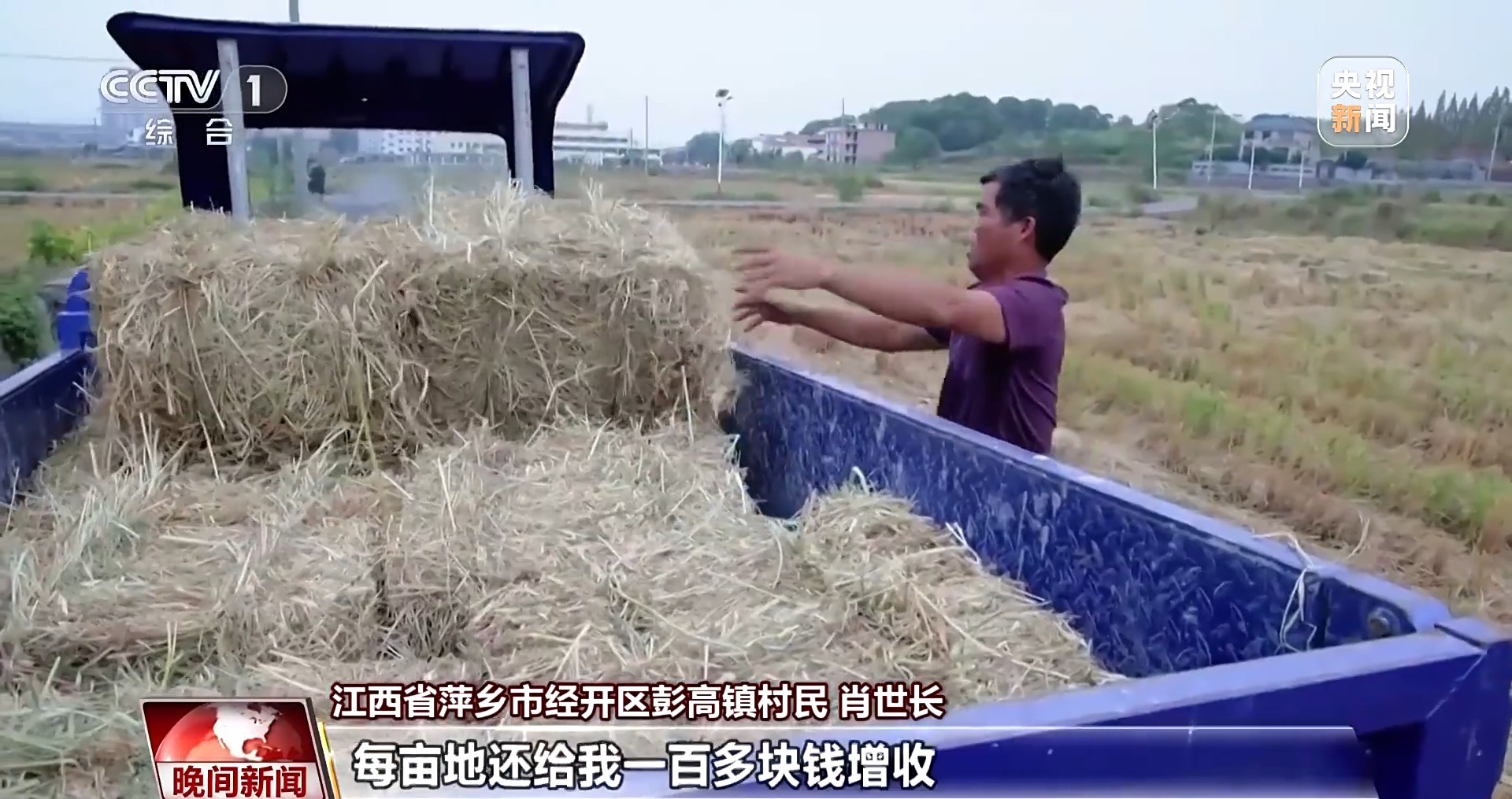 *江西省萍鄉市經開區彭高鎮村民 肖世長:*秸稈處理很麻煩,運走還需要自己額外花錢請人過來幫忙。現在他們上門回收,每畝地還給我一百多塊錢增收。