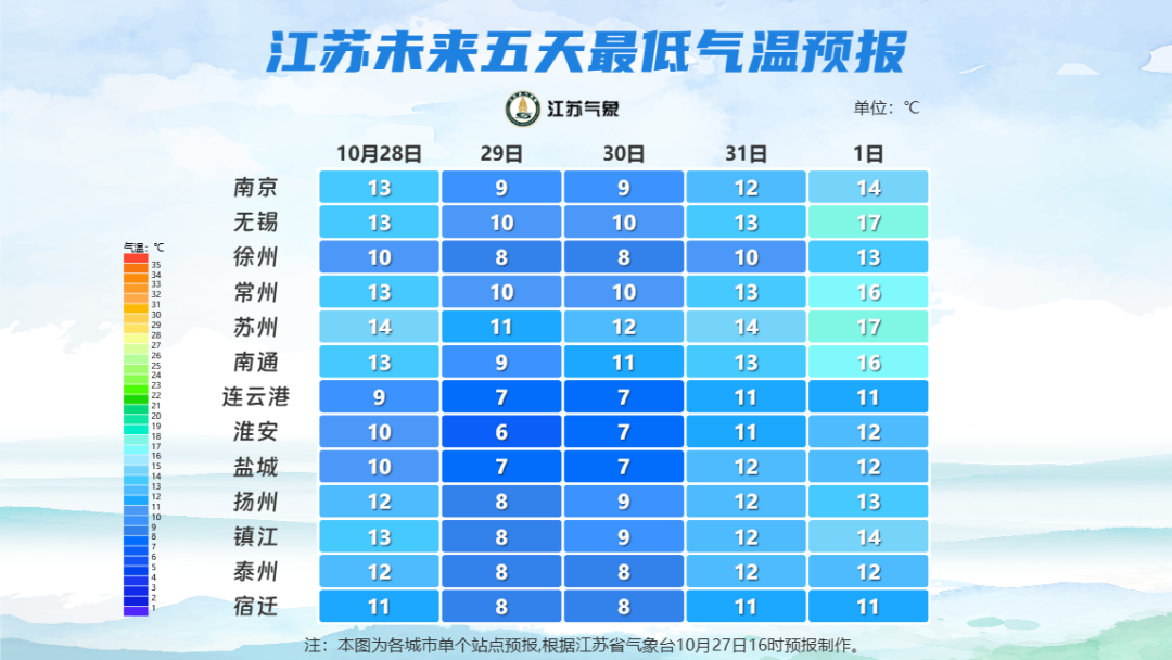 其中,淮安29號的最低氣温僅*有6℃*左右,*連雲港、鹽城**7℃*左右,體感較冷,需要注意保暖。