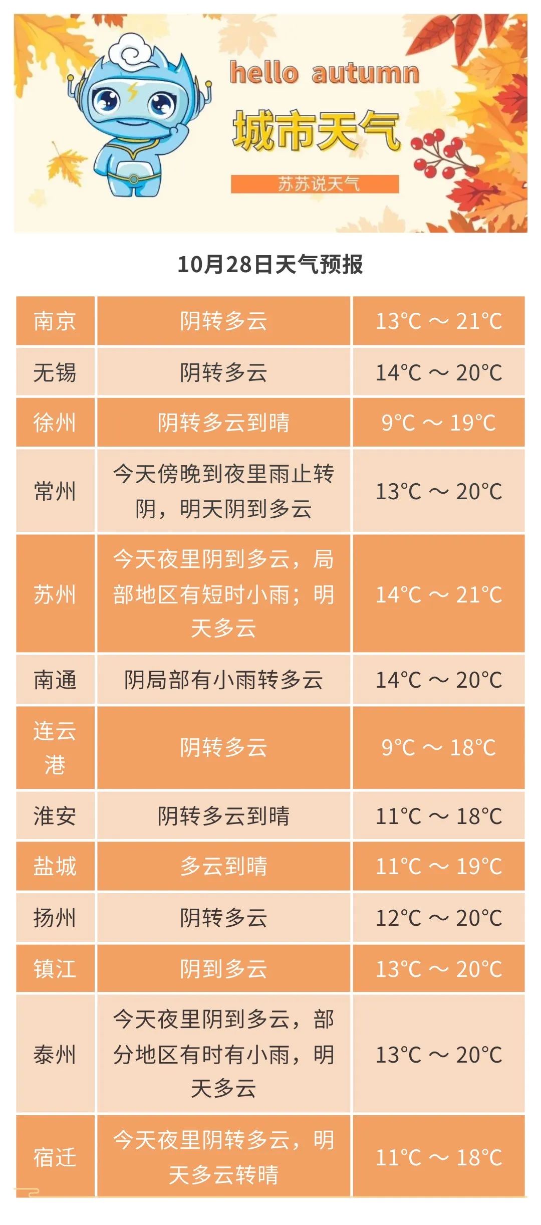 全省晴到多雲。最高温度:全省19℃左右;最低温度:沿淮和淮北地區6~7℃,蘇南地區*10℃*左右,其他地區8~9℃。全省偏北風4級左右。