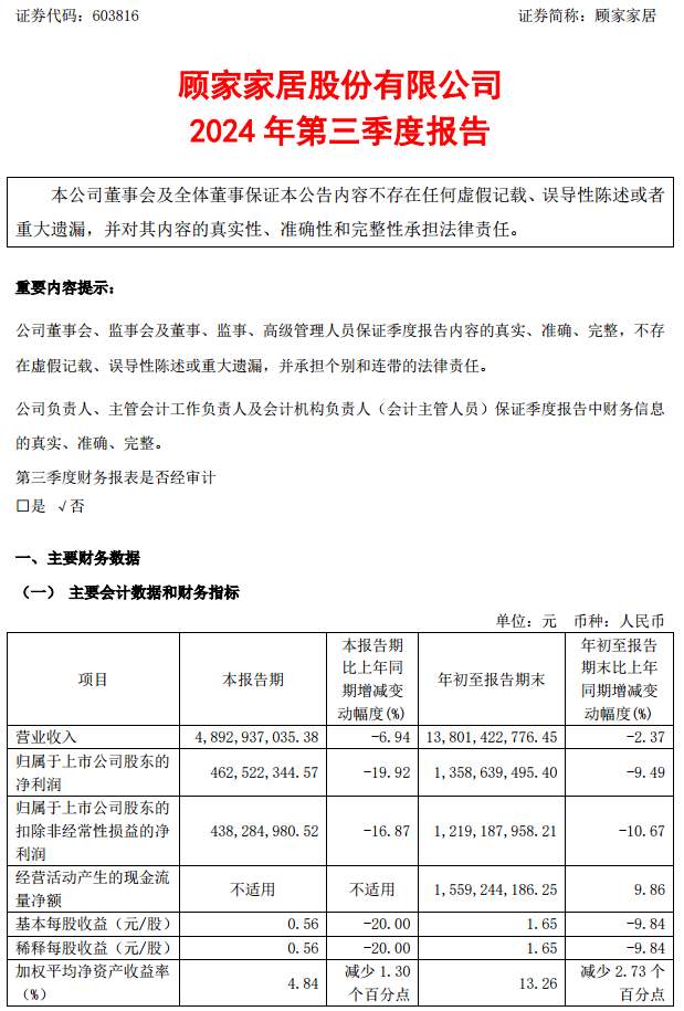 *【環球網消費綜合報道】*家居企業顧家家居(603816.SH)公佈的2024年三季報顯示,公司實現營業總收入為138.01億元,同比下降2.37%;歸母淨利潤為13.59億元,同比下降9.49%。值得注意的是,這是顧家家居淨利潤連續第二個季度出現下滑,且下滑幅度有所加劇。