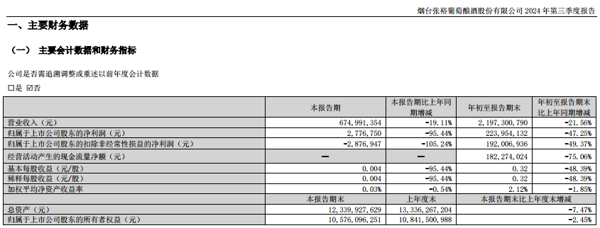*【環球網消費綜合報道】*國產葡萄酒企業張裕A(000869)公佈的2024年三季報顯示,公司營收、淨利潤雙下滑。值得關注的是,公司第三季度扣非淨利潤虧損287.69萬元,為近十年來首次出現單季度虧損。在葡萄酒市場需求持續萎縮的背景下,張裕A面臨嚴峻的壓力。