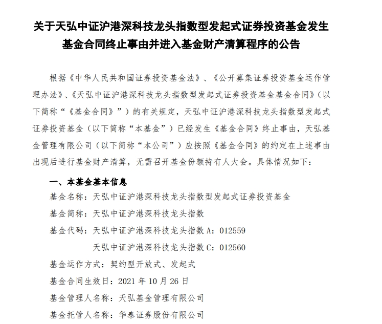 進一步來講,天弘中證滬港深科技龍頭指數為發起式基金,基金《基金合同》生效日為 2021 年 10 月 26 日,《基金合同》生效之日起三年後的對應自然日為 2024年10月26 日。經註冊登記機構確認,截至 2024 年10月26日,本基金規模低於2億元,已觸發終止情形。