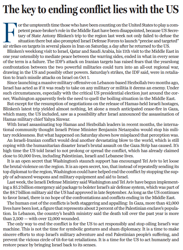 一個公開的秘密是,正是華盛頓的姑息縱容促使以色列到處出擊,大打出手。華盛頓本應通過停止向以色列提供先進武器裝備和援助來幫助結束衝突,而不是一面派遣外交官前去作秀,一面向中東調兵遣將,為以色列助陣。