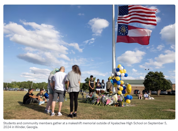 2024年9月5日,學生和社區成員聚集在佐治亞州温德市阿巴拉契高中外的臨時紀念碑前。前一日,該校發生槍擊事件,造成4人死亡,9人受傷。(ABC News報道截圖)