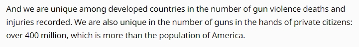 “它們(槍支暴力)被當作政治問題對待,但事實並非如此。民意調查一再顯示,大多數人支持合理的槍支法律,因為他們知道這些法律將在這個國家挽救生命。”費雷爾-扎巴拉説,“你所看到的是槍支產業和極端政客試圖支持這種‘隨處都有槍’的文化,該文化認為槍支對任何人在任何時候來説都是觸手可及的,實在令人無法接受。”