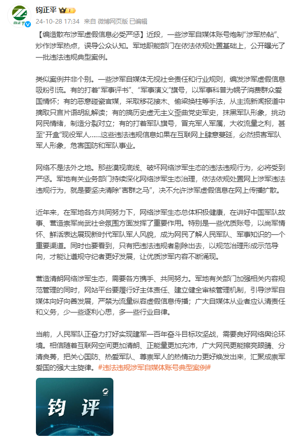 類似案例並非個別。一些涉軍自媒體無視社會責任和行業規則,編髮涉軍虛假信息吸粉引流。有的打着“軍事評書”、“軍事演義”旗號,以軍事科普為幌子消費羣眾愛國情懷;有的惡意碰瓷官媒,採取移花接木、偷樑換柱等手法,從主流新聞報道中摘取隻言片語胡亂解讀;有的搞歷史虛無主義歪曲黨史軍史,抹黑軍隊形象,挑動網民情緒,製造分裂對立;有的打着軍隊旗號,冒充軍人軍屬,大收流量之利,甚至“開盒”現役軍人……這些違法違規信息如果在互聯網上肆意蔓延,必然損害軍隊軍人形象,危害國防和軍隊事業。