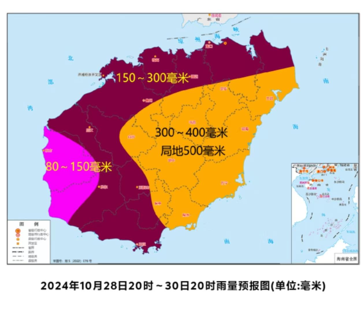 海南省氣象台預計,受“潭美”殘渦和冷空氣共同影響,28日夜間—30日白天,海南島大部地區有暴雨到大暴雨,文昌、定安、瓊海、萬寧、屯昌、瓊中、白沙、五指山、保亭和陵水等市縣累積雨量300~400毫米、局地500毫米,海口、澄邁、臨高、儋州、昌江和三亞等市縣150~300毫米。30日夜間,強降水過程逐漸結束,海南島以陣雨天氣為主。