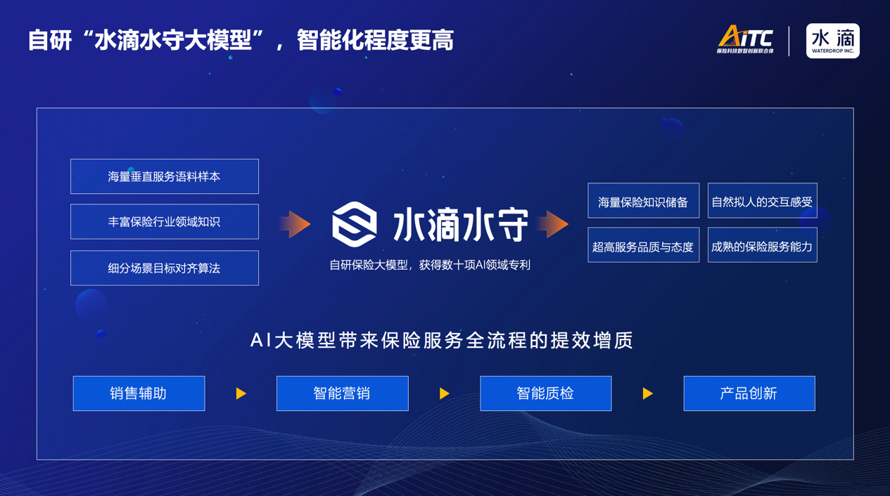 沈鵬介紹,2019年開始,水滴開始投入AI建設,每年的研發投入在3億元左右,並且組建了數百人的研發團隊,團隊核心成員均來自北大、清華、中科院等名校,在AI領域獲得了數十項技術專利。基於長期的技術投入,水滴自研了保險垂直領域大模型——水滴水守大模型,已在輔助銷售、智能營銷、智能質檢、產品創新等全場景中進行應用。