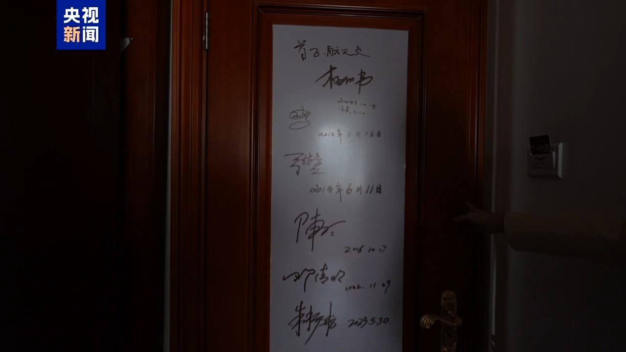 房間門後整整齊齊地簽着航天員們的名字。按照慣例,航天員出征前都會在自己的房間門板上簽名,這也是中國航天接續發展的最好見證。