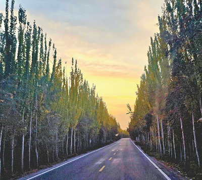新疆喀什地區麥蓋提縣,一條寬闊的柏油路通往遠方。道路兩旁,沙棗、紅柳、梭梭等連片的生態林長勢茂盛。