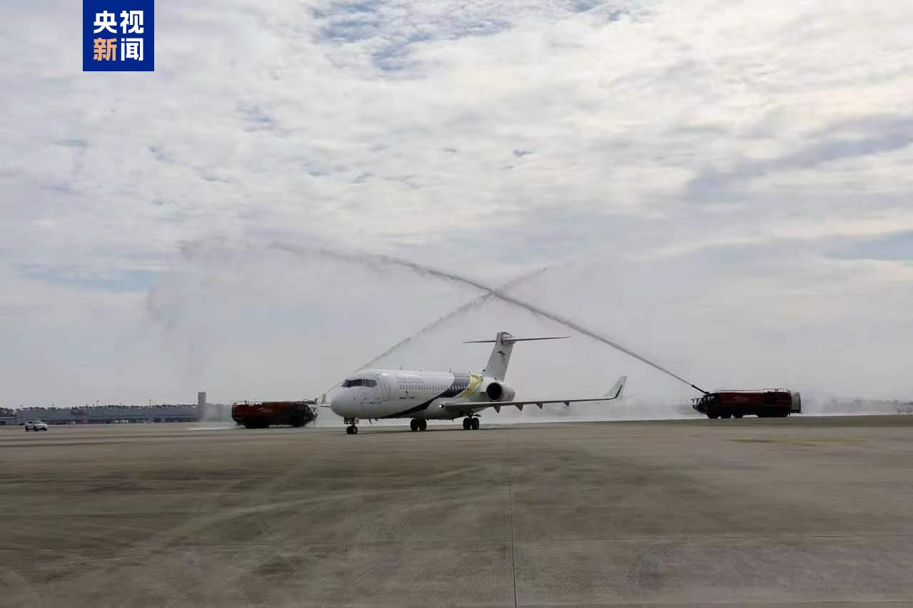 最長商業航線首航成功 白雲機場“水門禮”迎接國產飛機ARJ21回家