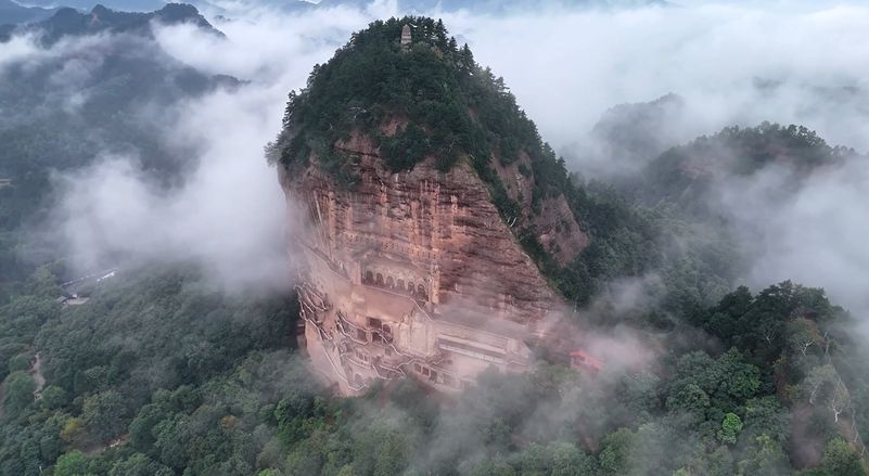 這裏是位於甘肅省天水市的麥積山石窟。1600多年前,篤信佛學的後秦皇帝姚興在此開鑿了第一座洞窟。此後,十多個王朝接力營建,造就了這一留存大小窟龕221個、造像3938件10632身、壁畫1000餘平方米的“東方雕塑陳列館”。