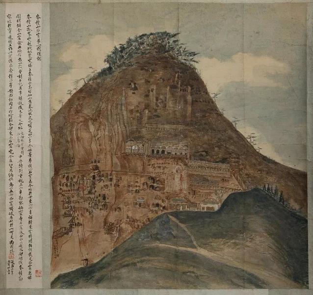 圖為馮國瑞繪製的麥積山石窟全景。新華社發