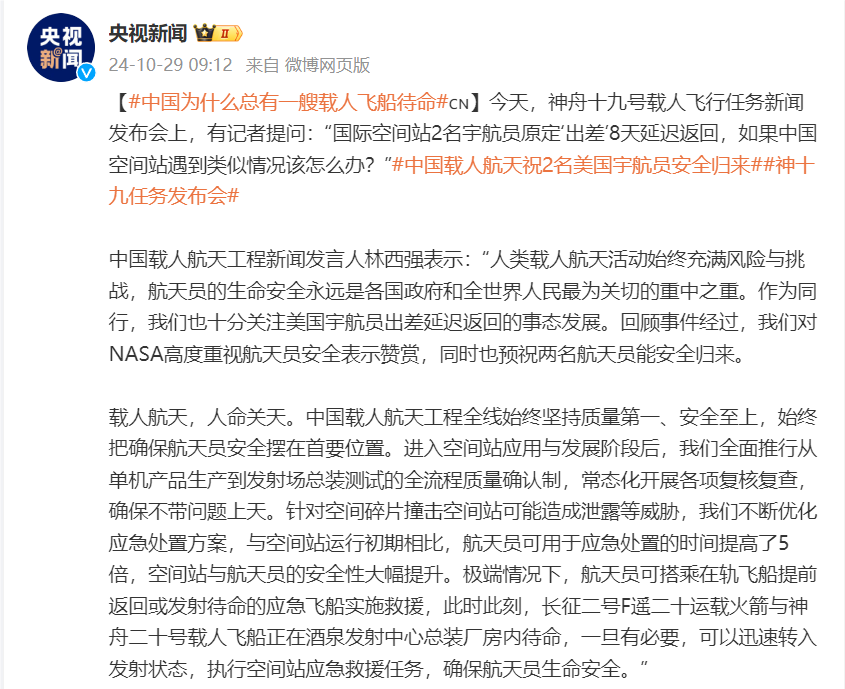 今天,神舟十九號載人飛行任務新聞發佈會上,有記者提問:“國際空間站2名宇航員原定‘出差’8天延遲返回,如果中國空間站遇到類似情況該怎麼辦?”
